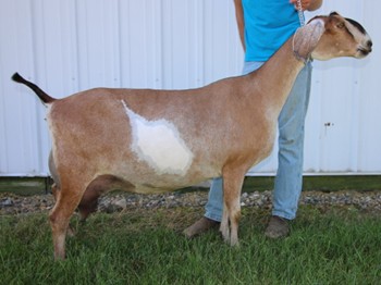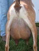 This pretty lady did not get a chance to be shown this year. I love her length of body, breed character and dairy strength. However, she has a little more slope to her rump than I prefer. Hopefully, she will level out a bit in that respect after she freshens late next spring. However, here is what I believe is going to happen……she is going to freshen with a pretty udder but still retain a little more slope to that rump than I prefer.
