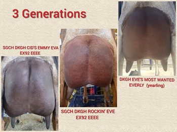 Three Generations of Lovely Udders...![]() SGCH DKGH Cid's Emmy Eva Ex92(EEEE) SGCH DKGH Rockin' Eve Ex92(EEEE) DKGH Eve's Most Wanted Everly (yearling) (Photo courtesy of Dan Greene) |