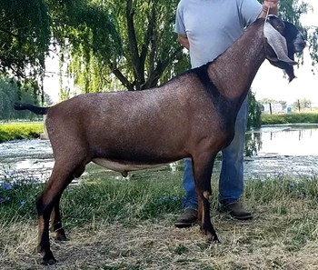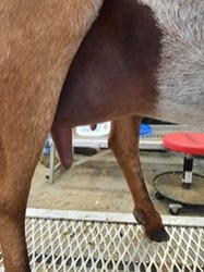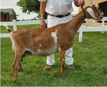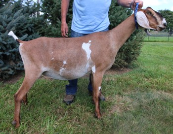 Simply stated, I love this doe! She excels in general appearance with a mammary system that is stunning! As I write the narrative on Affair she still has one more show to go this year and that is the Kansas State Fair. She has done unbelievably well in the show ring this year already winning Best In Show six times as well as Best Udder In Show several times of the nine shows we have attended. We will be freshening a daughter of Affair’s who will be a first freshening 2-yr-old this coming spring. Her doeling from this spring is the spitting image of Affair but I believe she is going to be too small to breed yet.